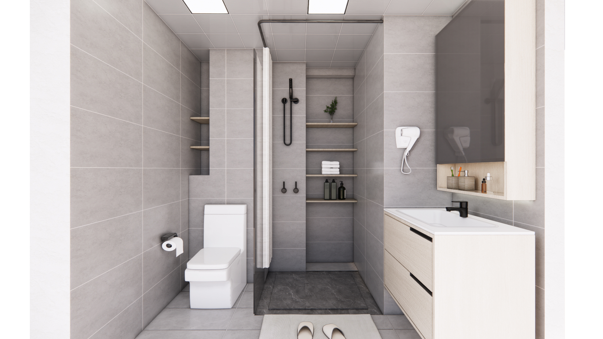 设计在比较有限的空间内,保障了基本生活需求后,尽可能放大一个相对独立的完整空间,供租客根据喜好使用,以满足不同的需求。将极简、整齐的家装与直接、外露的结构管线形成对比,搭配以局部暖色的跳色处理,体现非常规精装房的设计感,营造出时下翻红的解构主义工业风格。建筑本身外露的结构下,装饰一个舒适的小家,也象征在钢筋混凝土的城市里,有一个温馨的小窝。居住其中,会有一个别样的体验。