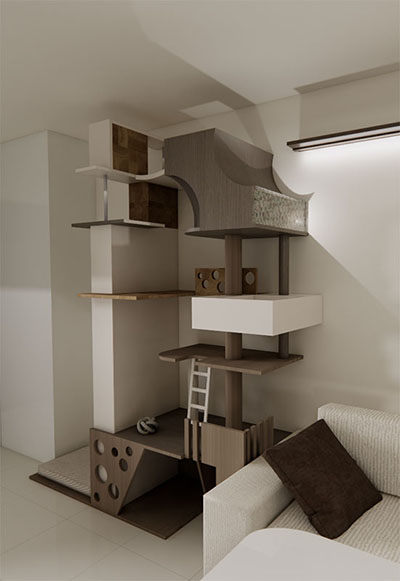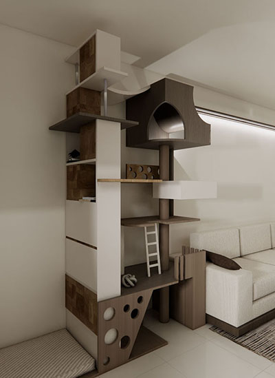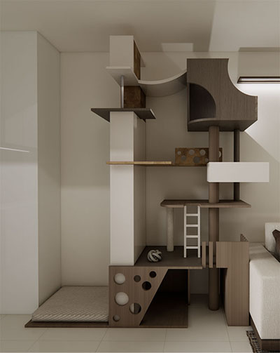 为满足人与宠物对空间的需求,该产品将储物柜以及猫爬架结合在一起,以增加产品的利用率。同时为了能提供足够的储物空间并满足宠物猫喜欢爬高的爱好,我们将猫爬架高度增加到2.4米,使其在垂直空间得到充分利用。在材料方面,猫爬架采用了环保木材以及剑麻材质以便满足猫咪的生活习性,并且猫爬架中多次出现的半封闭猫窝也能为猫咪提供充足的休息空间。