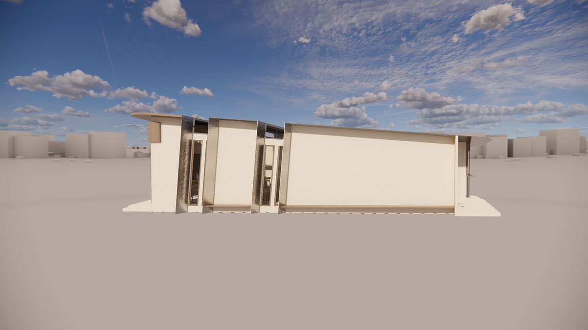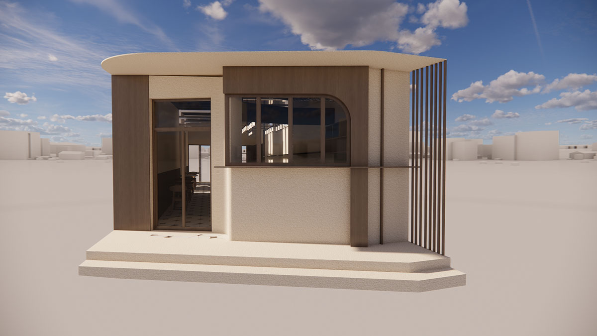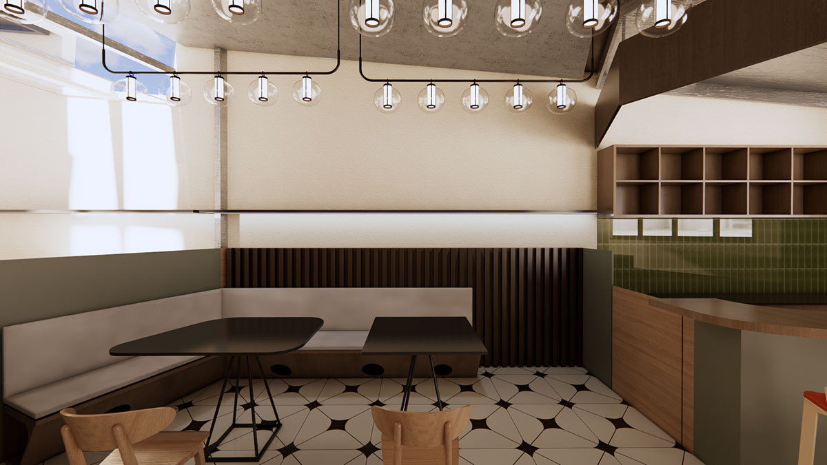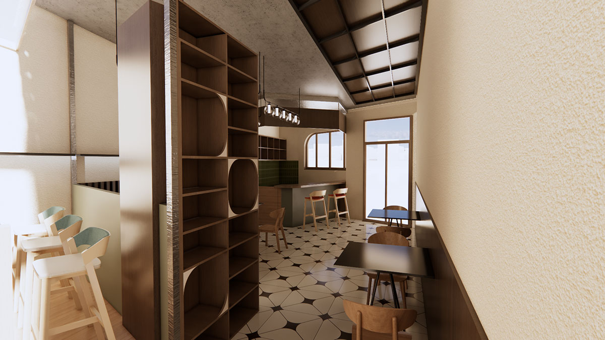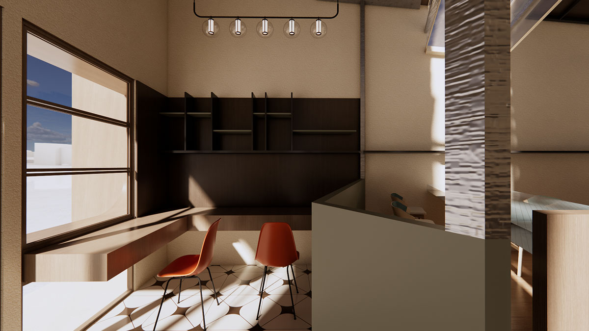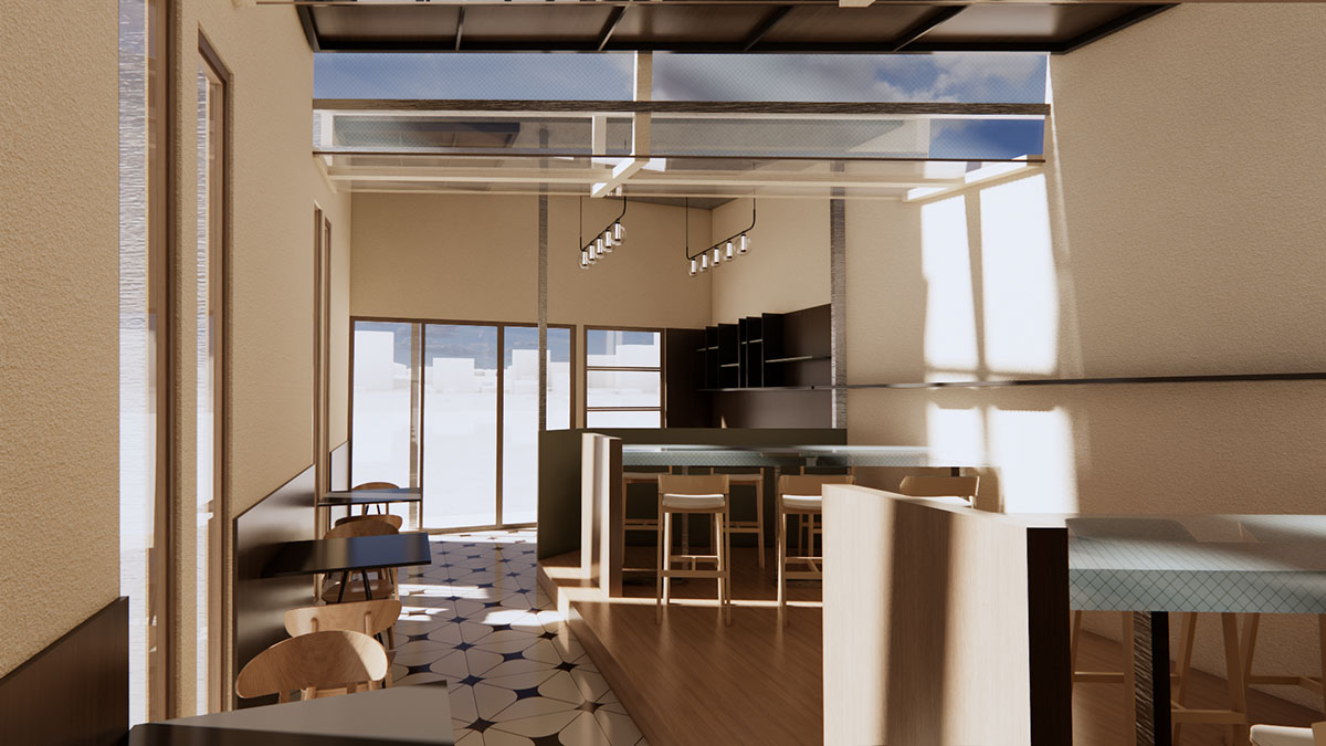 浪飞猫咖位于工业园区一楼,平面布局较为狭长,且内部采光较差,为了解决采光等其他问题,决定将猫咖部分屋顶做下沉处理,并将下沉部分做成全部由玻璃覆盖的形式,以便满足室内采光的需求,同时也在室内局部最大限度的打破室内外的阻挡,让人在室内也能感受到室外的变化。咖啡内部风格偏原木复古风与工业风的结合,整体配色偏暗,营造一种安静沉稳的氛围,为顾客提供一个休息,阅读的舒适空间。咖啡厅周围的绿植也通过建筑的玻璃将绿色传递到室内,与室内的暗色形成对比。